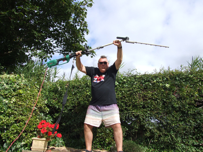 been), so I posed for a pic with the surviving hedgetrimmer. I look grim,
